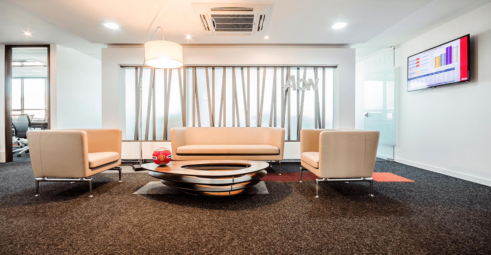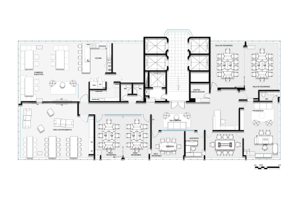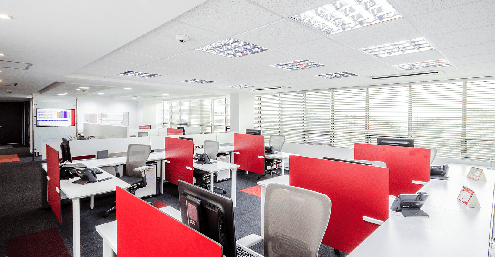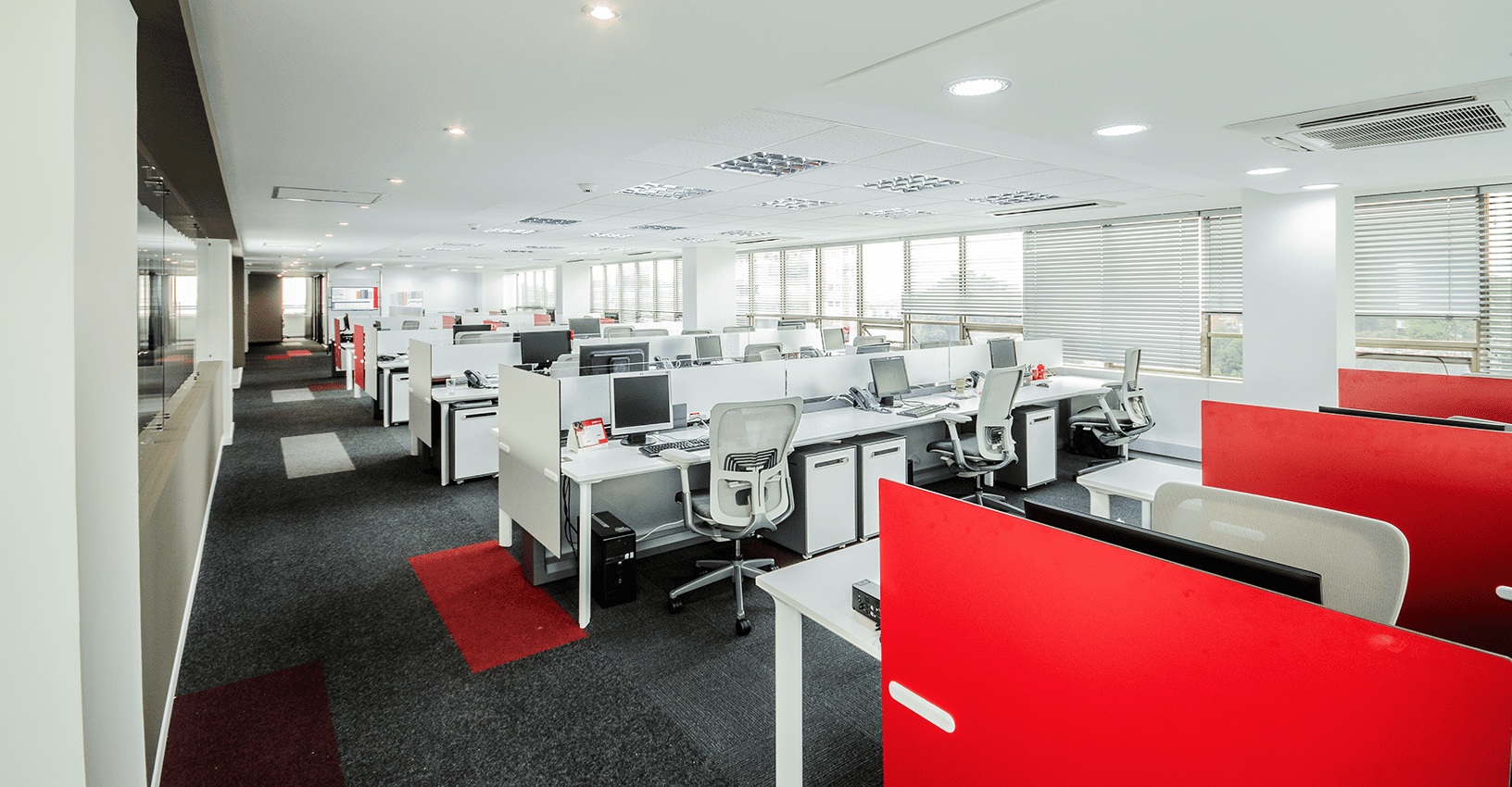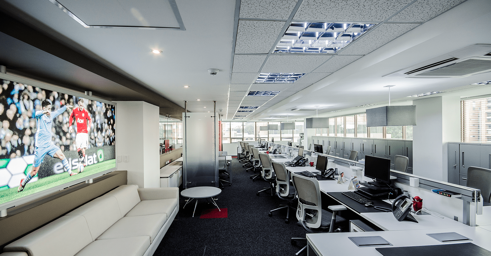 Ubicado en un edifico de más de 30 años de construido, y con muchas limitantes a nivel arquitectónico como techos bajos y ventanas pequeñas de vidrios oscuros, el concepto de diseño para este proyecto se basó en la aplicación del color rojo intenso del logo en áreas focales. El reto principal, fue lograr que el ambiente interior fuera vibrante y equilibrado, mediante el uso de tonos grises y blancos con acentos puntuales rojos en el mobiliario de Haworth, al igual que la diferenciación de alfombra por las distintas áreas de trabajo y colaboración. Se resalta la importancia de la marca y del trabajo en equipo mediante la aplicación gráfica en cajas de luz y elementos visuales en los muros y displays. En la zona de presidencia y áreas VIP como el comedor ejecutivo y las áreas de bienestar, se utilizaron productos de Vitra, Ligne Roset entre otros.