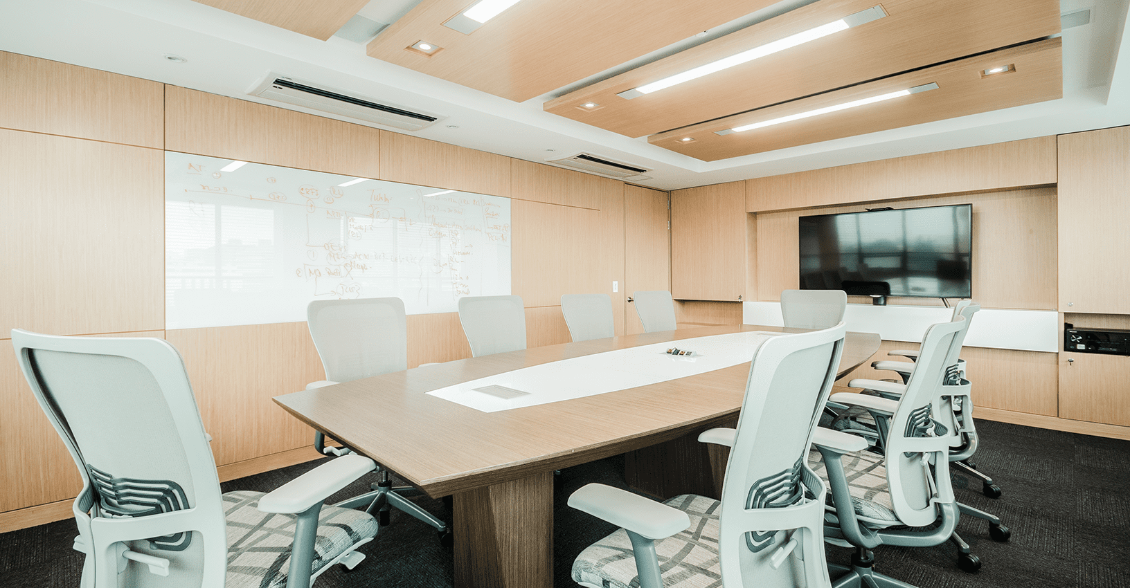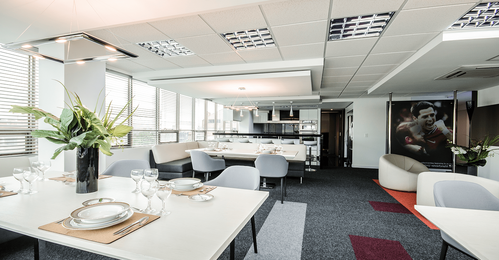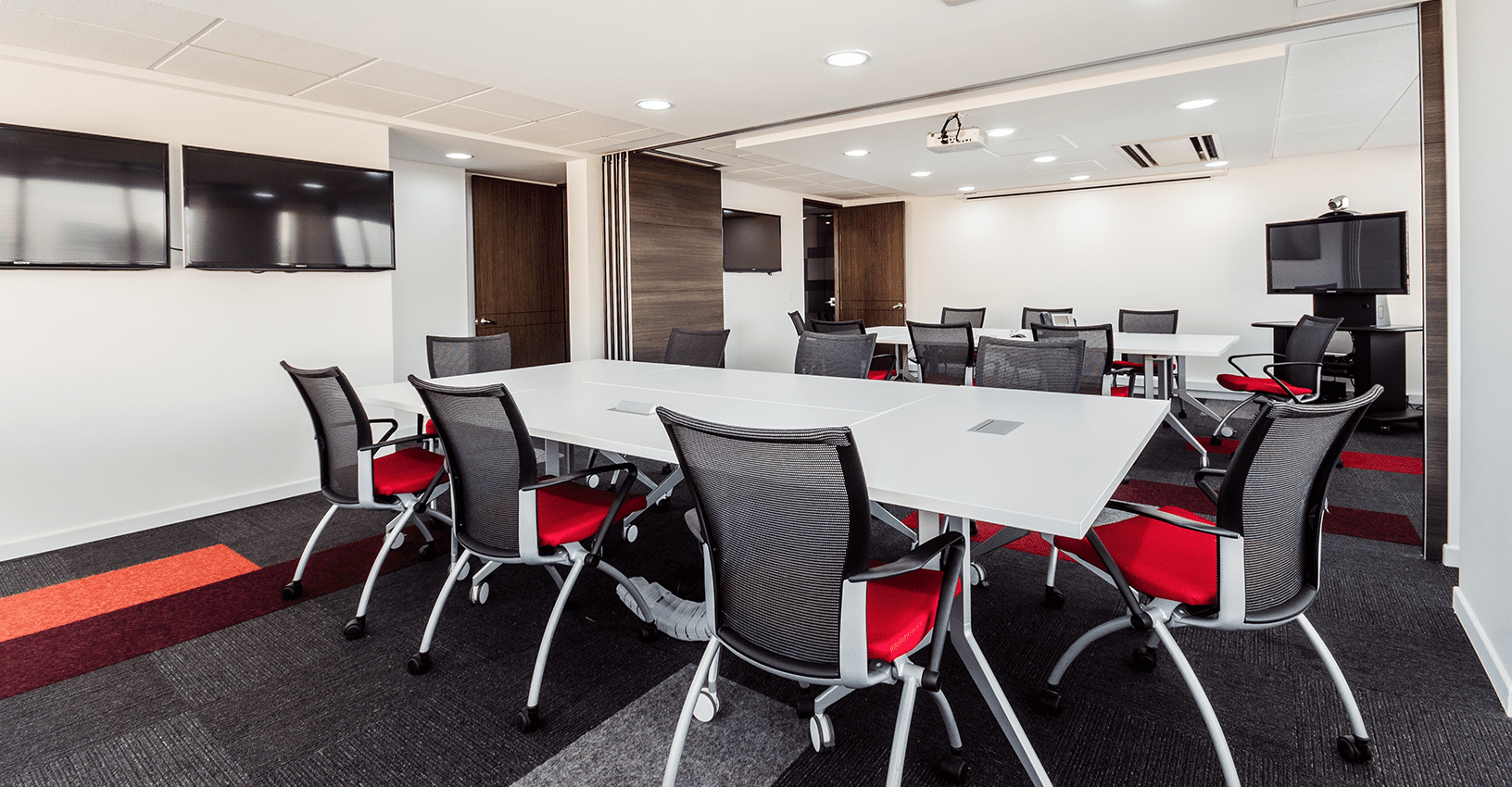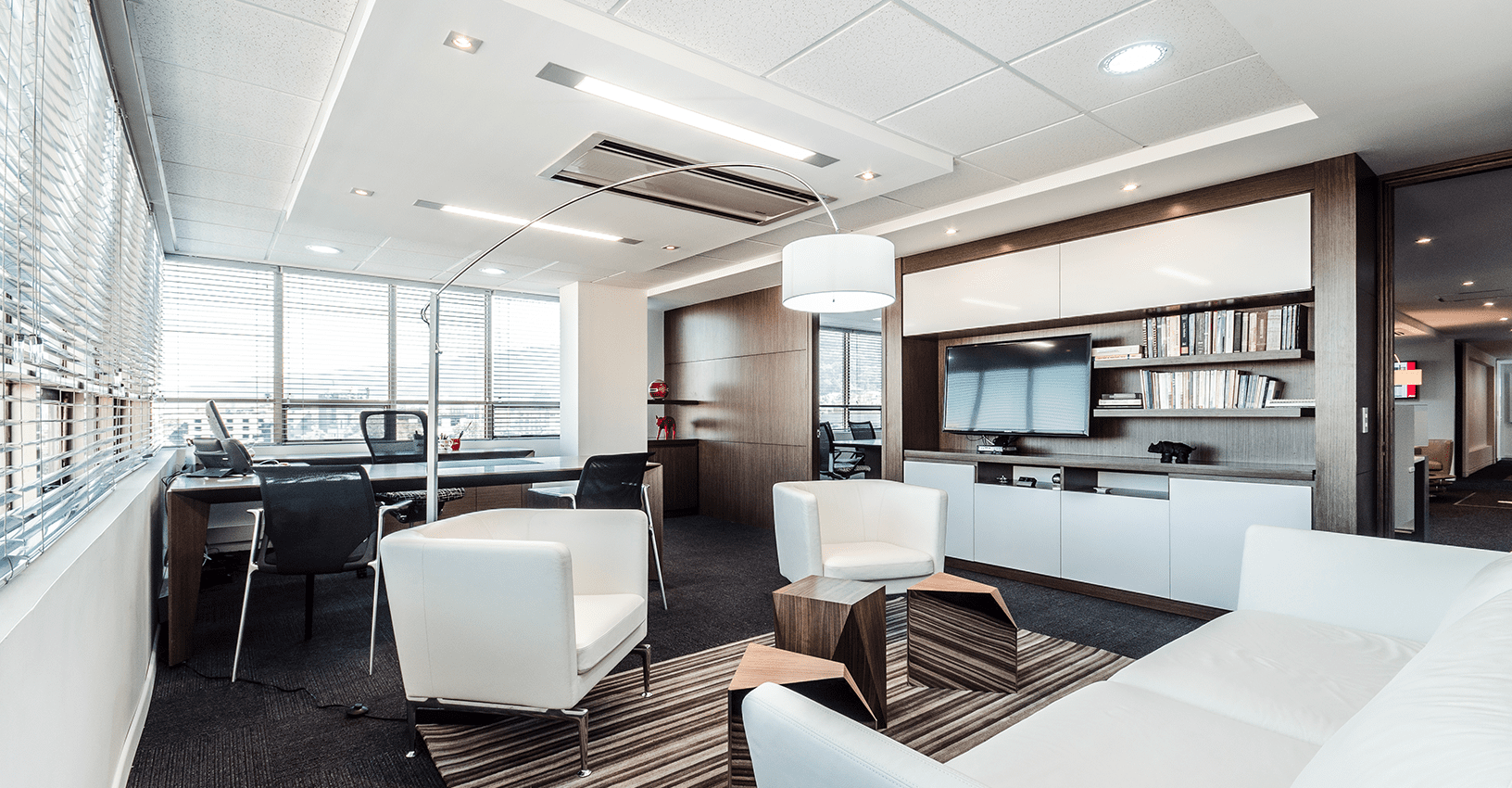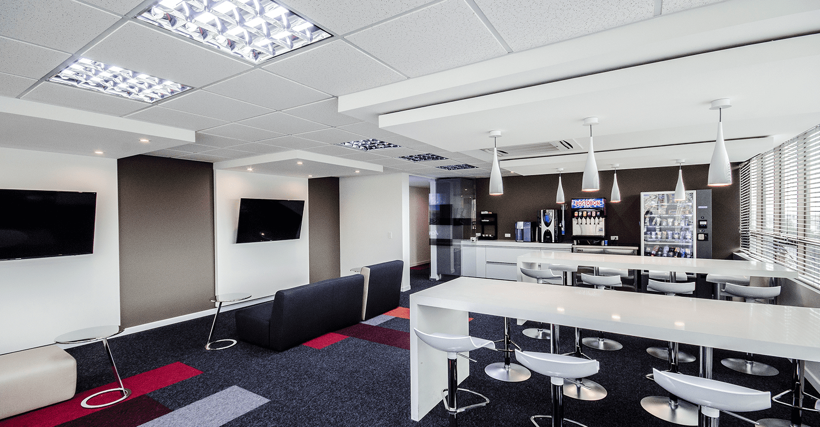 Ubicado en un edifico de más de 30 años de construido, y con muchas limitantes a nivel arquitectónico como techos bajos y ventanas pequeñas de vidrios oscuros, el concepto de diseño para este proyecto se basó en la aplicación del color rojo intenso del logo en áreas focales. El reto principal, fue lograr que el ambiente interior fuera vibrante y equilibrado, mediante el uso de tonos grises y blancos con acentos puntuales rojos en el mobiliario de Haworth, al igual que la diferenciación de alfombra por las distintas áreas de trabajo y colaboración. Se resalta la importancia de la marca y del trabajo en equipo mediante la aplicación gráfica en cajas de luz y elementos visuales en los muros y displays. En la zona de presidencia y áreas VIP como el comedor ejecutivo y las áreas de bienestar, se utilizaron productos de Vitra, Ligne Roset entre otros.