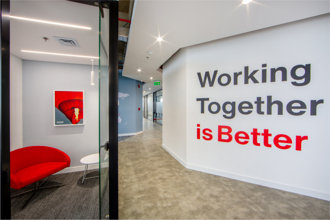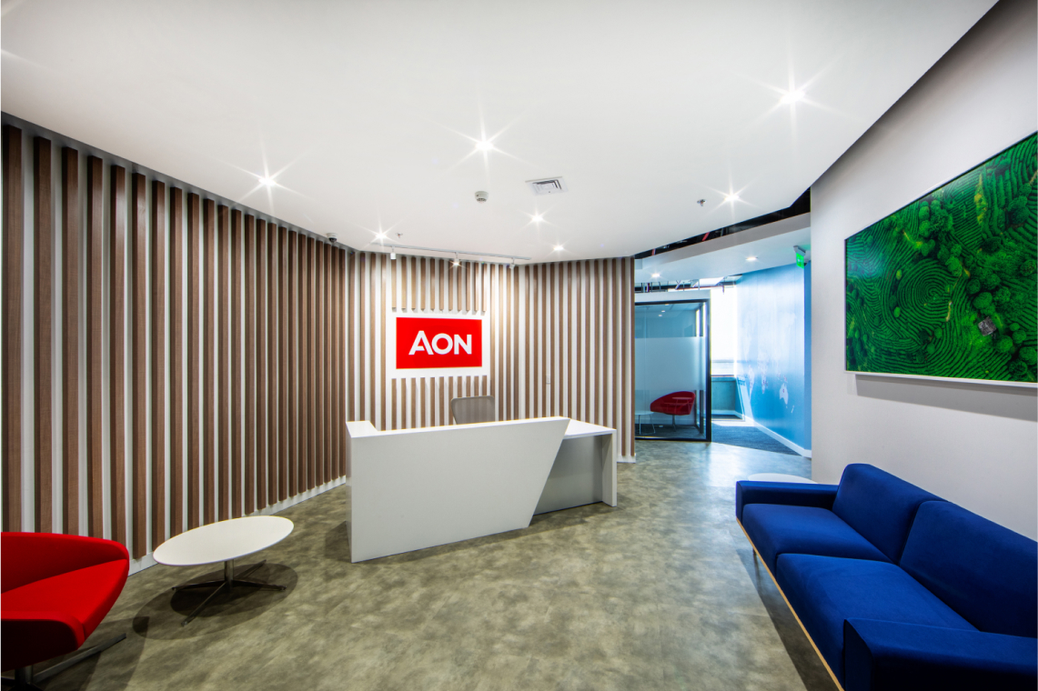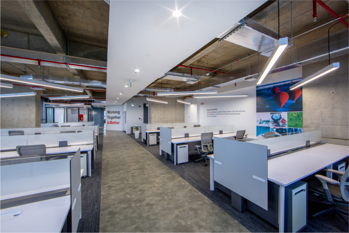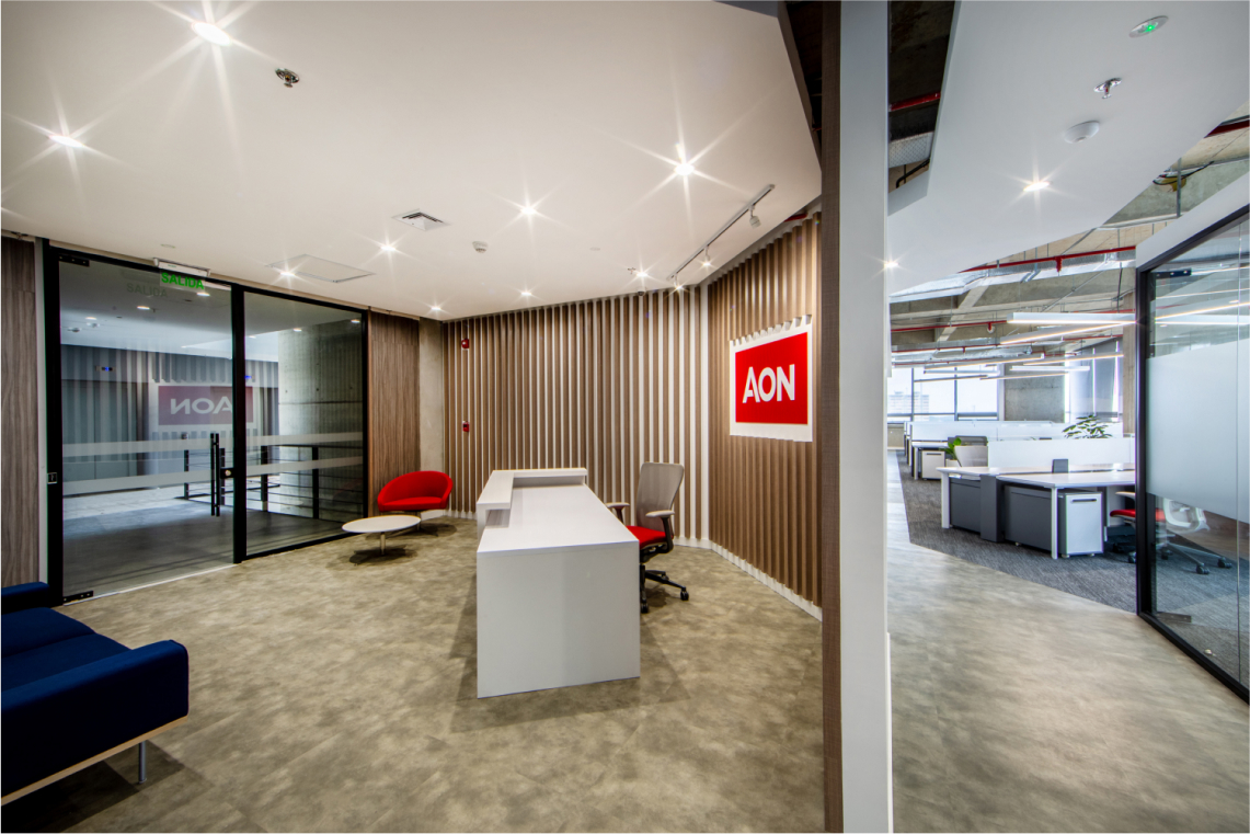 En este proyecto, se buscaba crear un layout limpio, creando un amplio espacio de bienvenida, se dividió la planta: separando las zonas de trabajo de las zonas de clientes, brindando áreas de colaboración y bienestar en el medio, para usos del equipo interno, como para visitantes o clientes. En cuanto a aspectos gráficos, junto con el área de mercadeo, se definieron puntos focales, para plasmar -mediante textos o imágenes- los valores y la nueva marca de AON. Los materiales utilizados fueron texturas tipo madera y concreto en los pisos, alfombra en zona de trabajo para confort acústico, contrastados con elementos verticales en perfilería negra y vidrio, techos abiertos para dar amplitud y un estilo industrial acorde a la arquitectura del edificio, y la iluminación fue uno de los protagonistas del proyecto, enmarcando cada zona de trabajo. El propósito del espacio consistió en crear un ambiente con carácter moderno, vibrante, y a la vez acogedor, que invitara a la colaboración, y fuera para todos, agradable regresar a trabajar en la oficina postpandemia.
