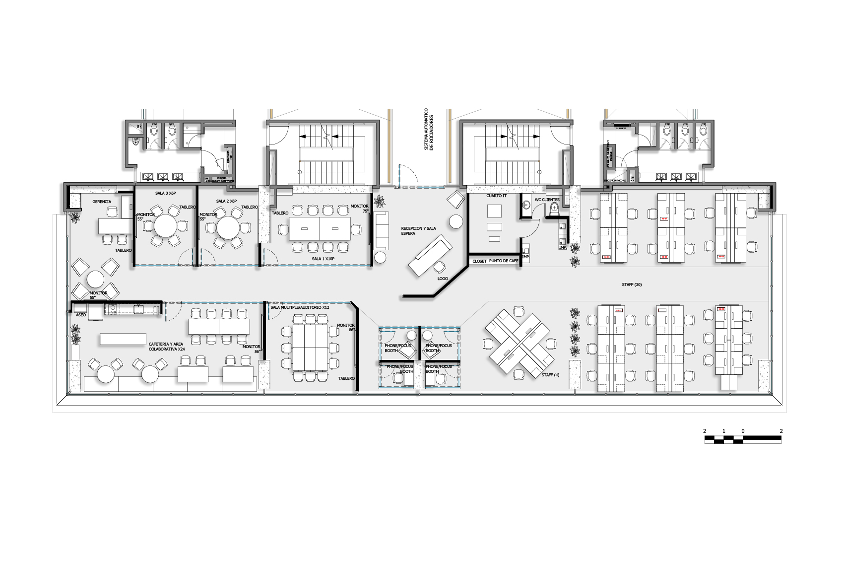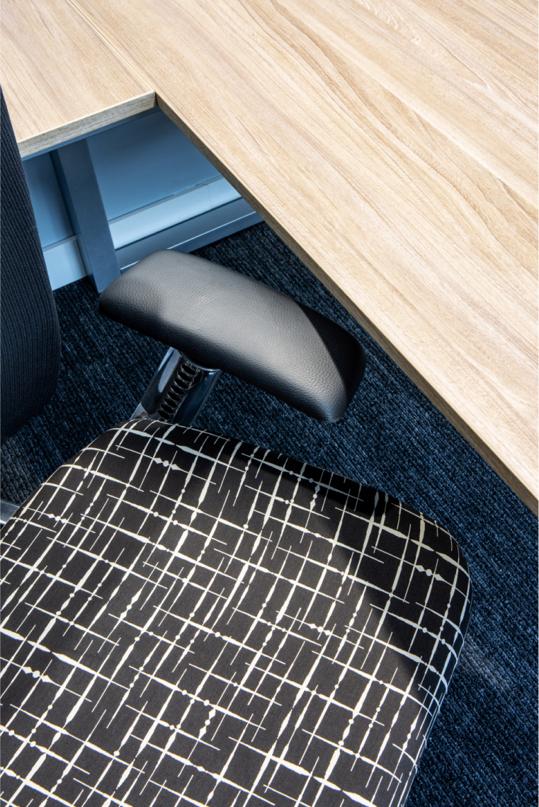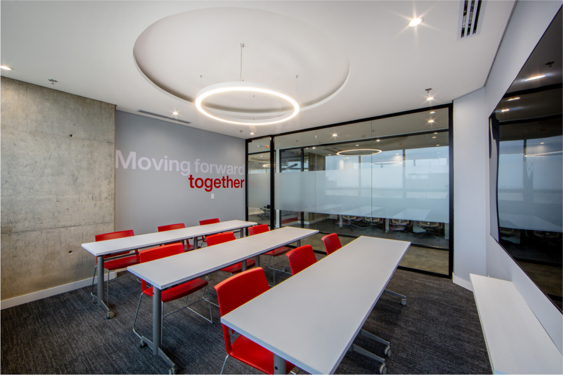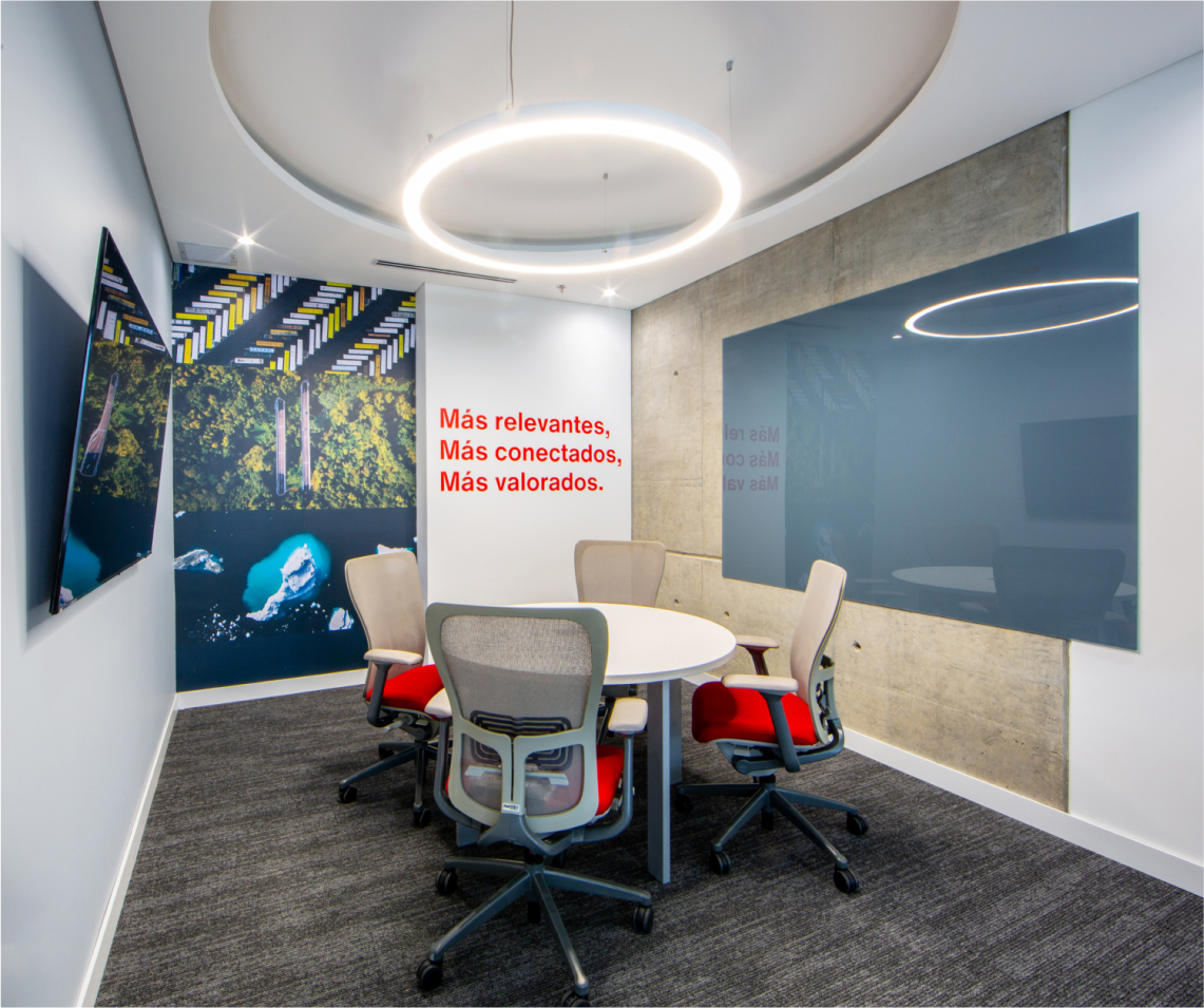En este proyecto, se buscaba crear un layout limpio, creando un amplio espacio de bienvenida, se dividió la planta: separando las zonas de trabajo de las zonas de clientes, brindando áreas de colaboración y bienestar en el medio, para usos del equipo interno, como para visitantes o clientes. En cuanto a aspectos gráficos, junto con el área de mercadeo, se definieron puntos focales, para plasmar -mediante textos o imágenes- los valores y la nueva marca de AON. Los materiales utilizados fueron texturas tipo madera y concreto en los pisos, alfombra en zona de trabajo para confort acústico, contrastados con elementos verticales en perfilería negra y vidrio, techos abiertos para dar amplitud y un estilo industrial acorde a la arquitectura del edificio, y la iluminación fue uno de los protagonistas del proyecto, enmarcando cada zona de trabajo. El propósito del espacio consistió en crear un ambiente con carácter moderno, vibrante, y a la vez acogedor, que invitara a la colaboración, y fuera para todos, agradable regresar a trabajar en la oficina postpandemia.