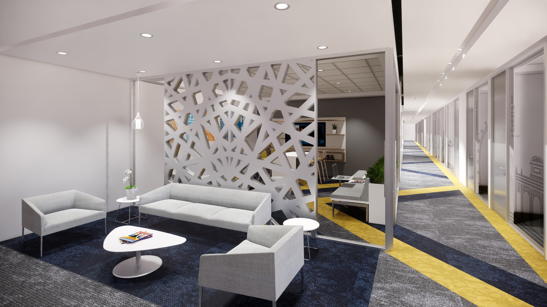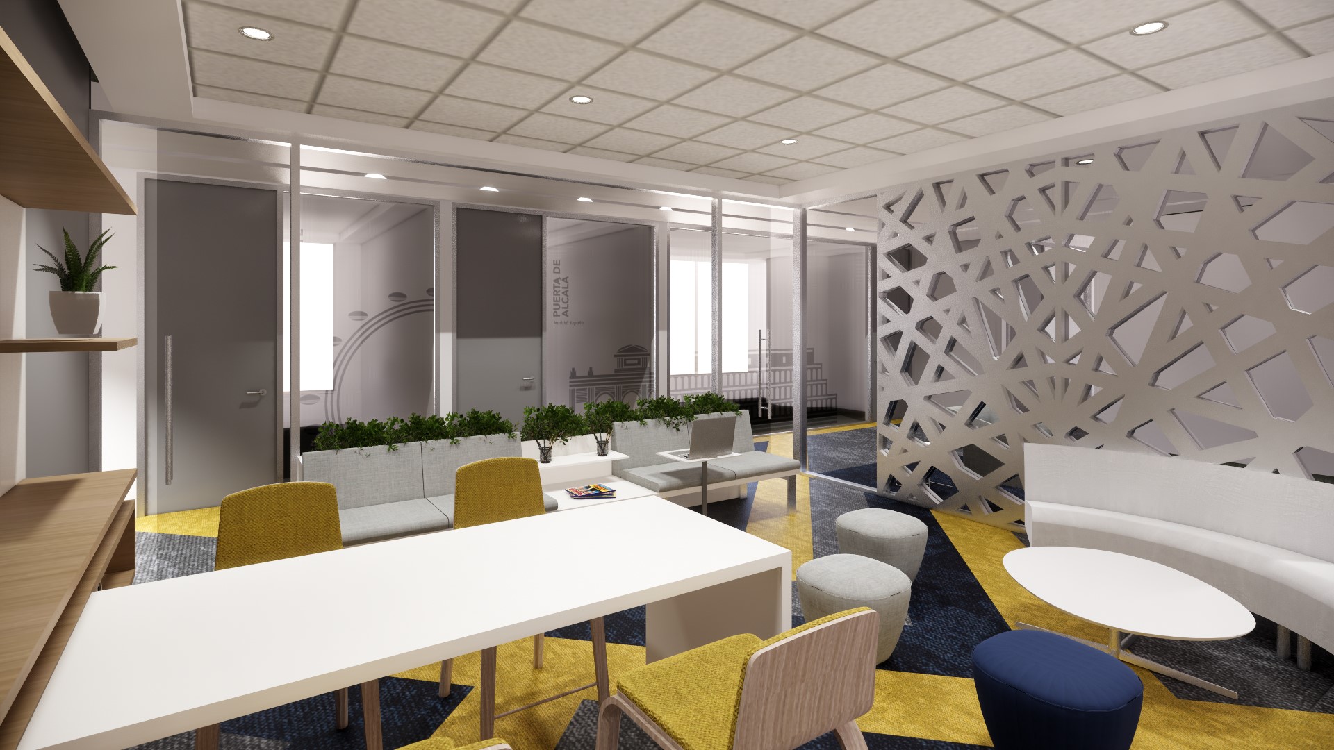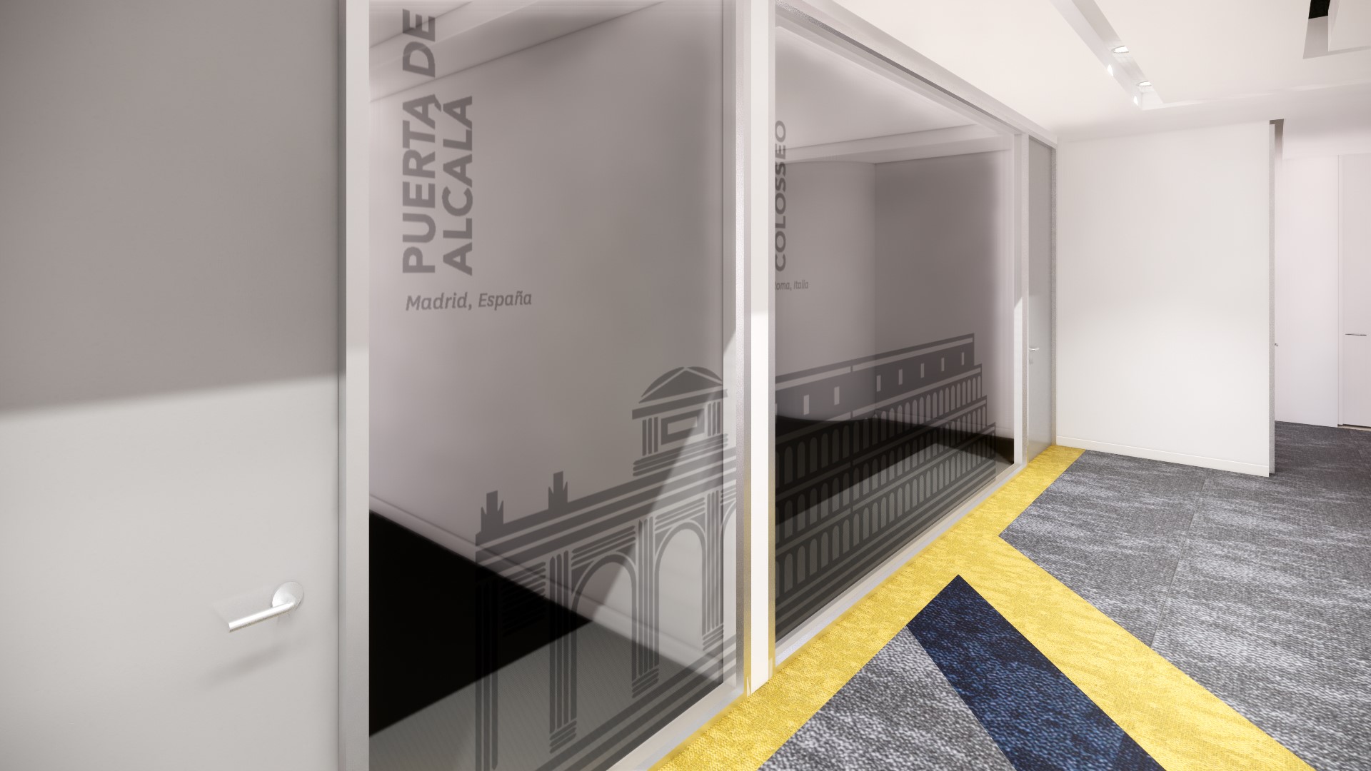 Disfrutamos todo el proceso de diseño: arquitectónicamente, nos inspiramos en la Bandera de la UE como elemento gráfico: mediante la descomposición formal de la Estrella como elemento representativo, se crearon tramas, retículas y texturas con líneas diagonales e intersecciones, que son aplicadas a los diferentes espacios arquitectónicos como pisos, muros, techos, y también. Se creo una paleta de color neutra, con acentos de los colores de la bandera: azul y amarillo. Para la ambientación desarrollamos piezas graficas e imágenes inspiradas en monumentos arquitectónicos de las diferentes delegaciones a nivel mundial, y se plasmaron fotografías en las zonas de circulación principal, y piezas gráficas lineales en el Frost de los vidrios de las oficinas privadas.