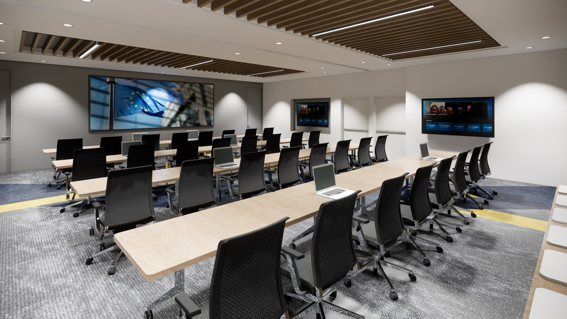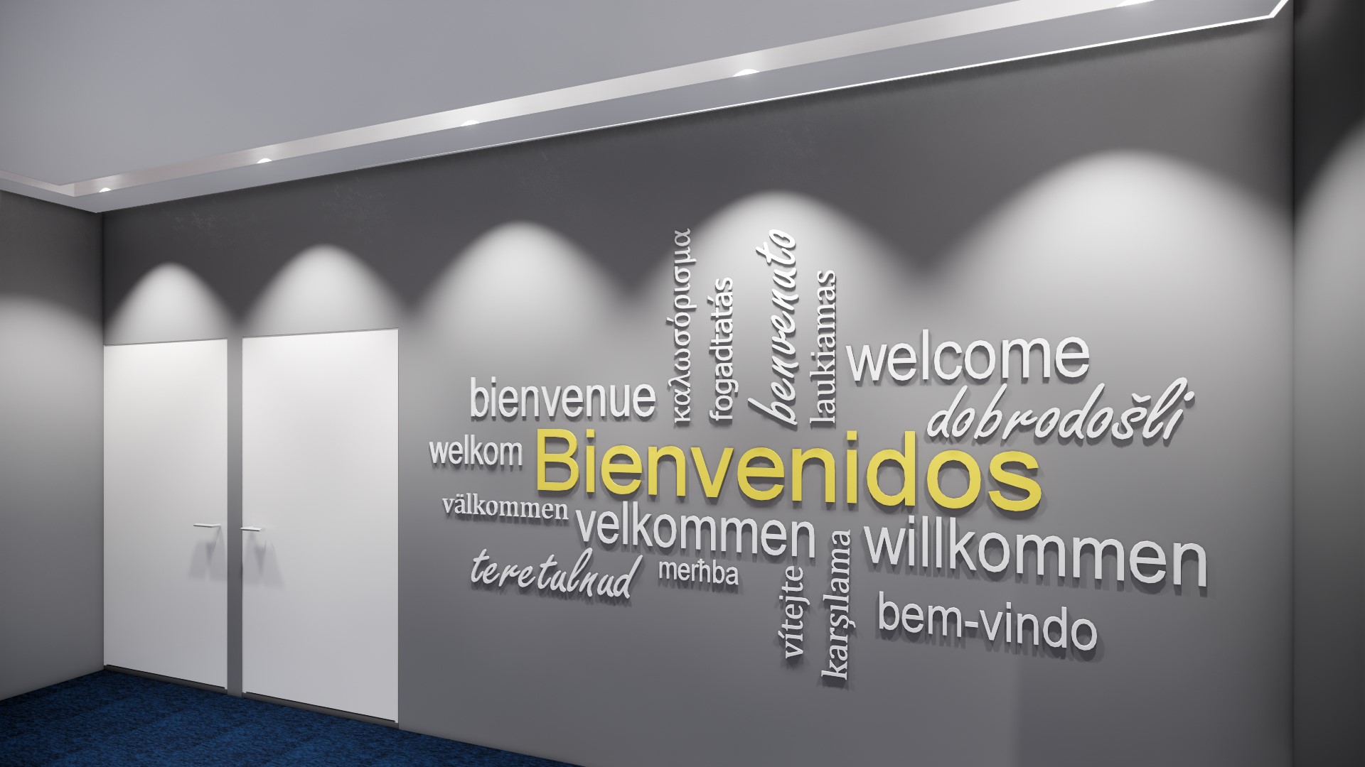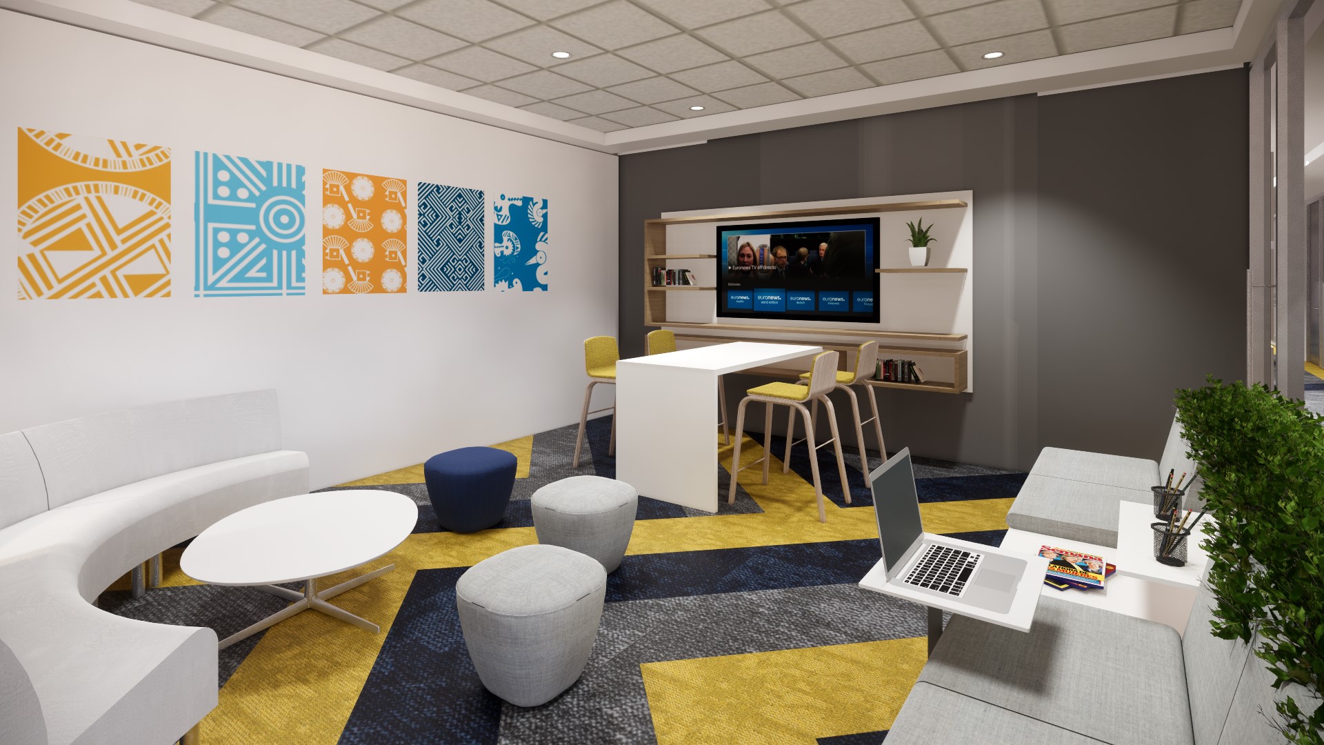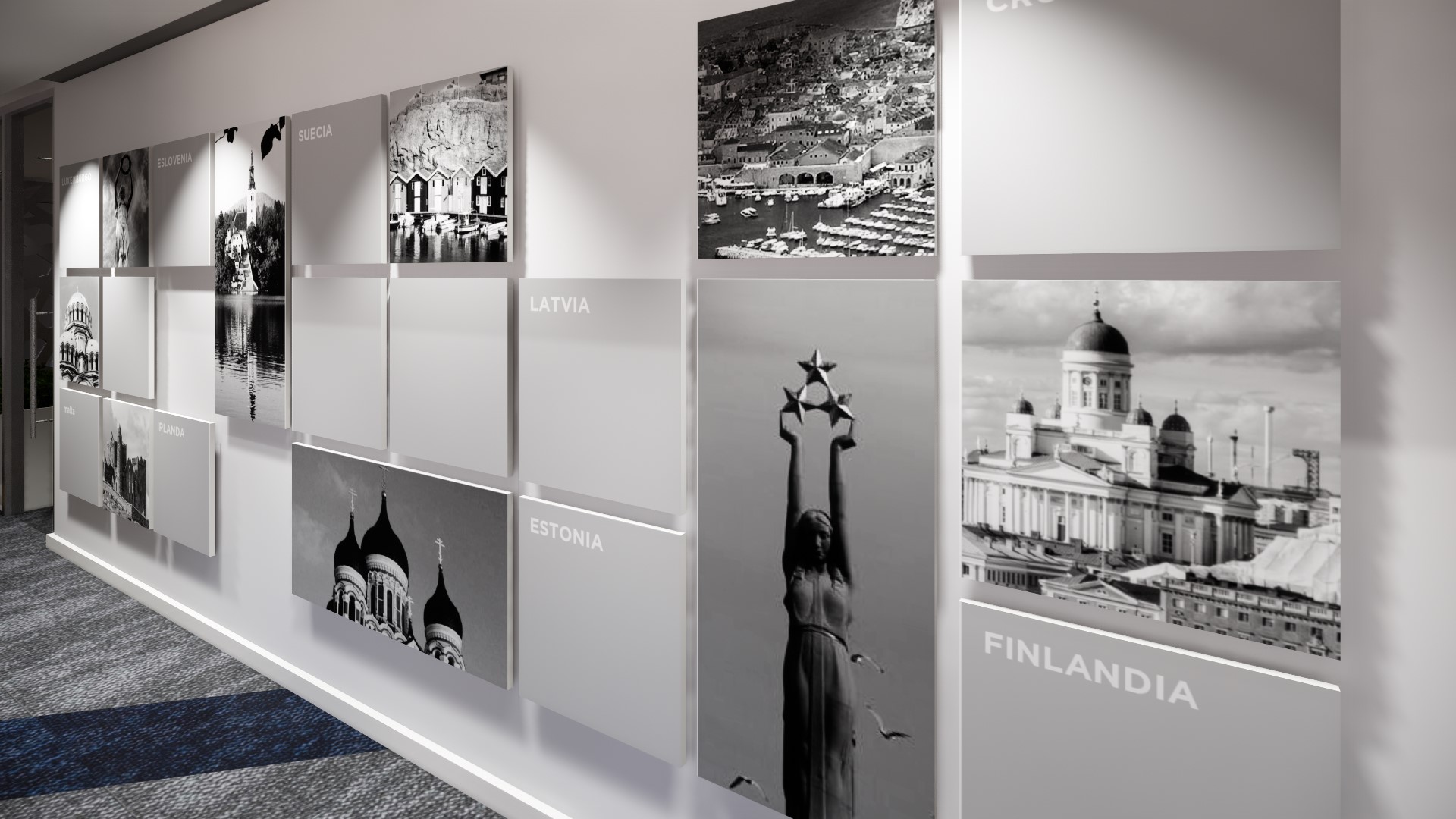 Disfrutamos todo el proceso de diseño: arquitectónicamente, nos inspiramos en la Bandera de la UE como elemento gráfico: mediante la descomposición formal de la Estrella como elemento representativo, se crearon tramas, retículas y texturas con líneas diagonales e intersecciones, que son aplicadas a los diferentes espacios arquitectónicos como pisos, muros, techos, y también. Se creo una paleta de color neutra, con acentos de los colores de la bandera: azul y amarillo. Para la ambientación desarrollamos piezas graficas e imágenes inspiradas en monumentos arquitectónicos de las diferentes delegaciones a nivel mundial, y se plasmaron fotografías en las zonas de circulación principal, y piezas gráficas lineales en el Frost de los vidrios de las oficinas privadas.