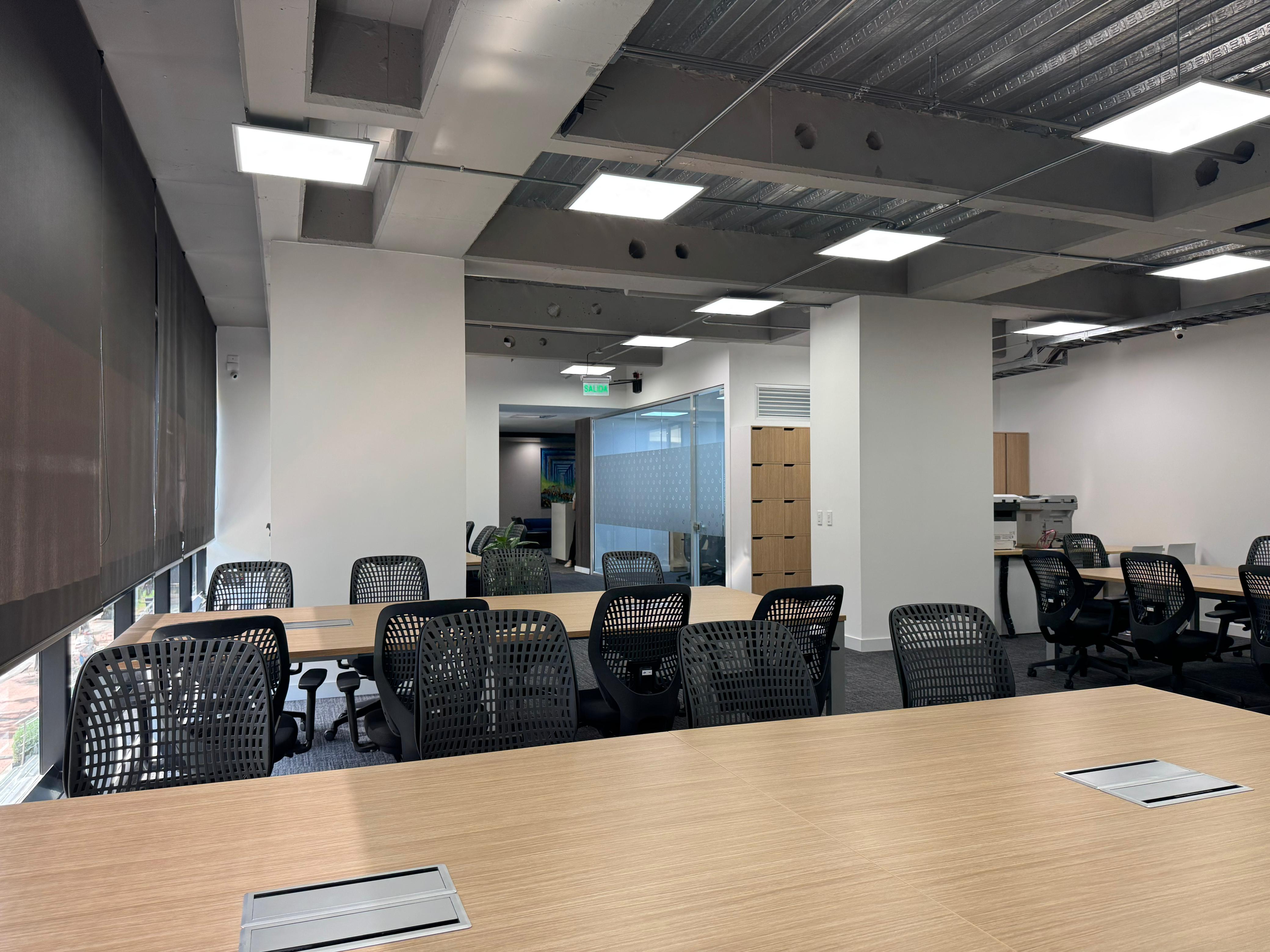 Además, diseñamos un mueble de lockers que permite mantener las estaciones de trabajo despejadas y organizadas. La vegetación fue estratégicamente ubicada para aportar frescura y vitalidad al ambiente, complementando así un espacio pensado para el bienestar y la productividad.